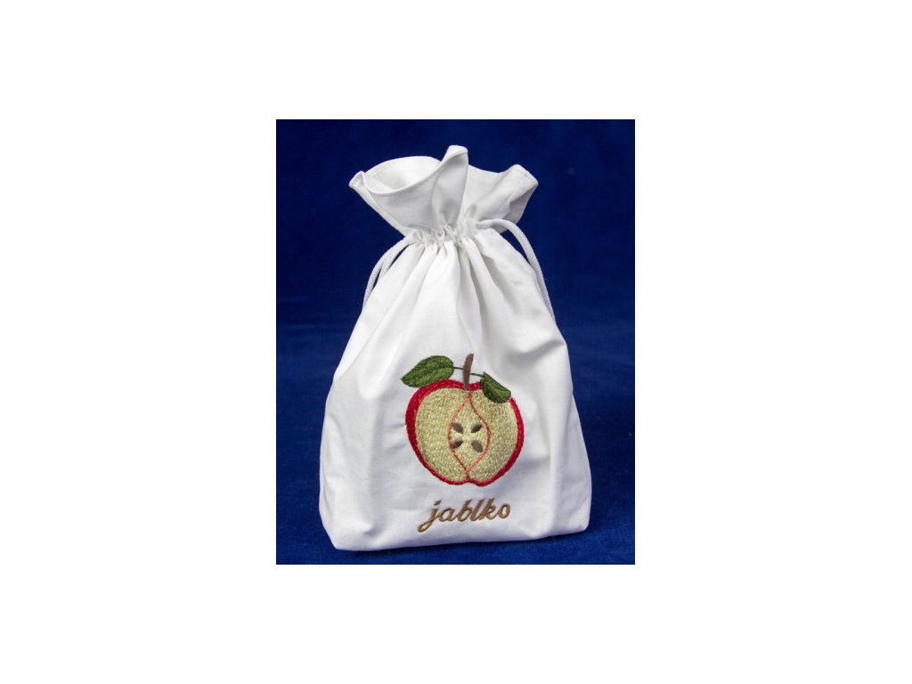 Praktický plátěný pytlík na sušená jablka s výšivkou. Půlené jablko je vyšito na pytlíku i s textem.Pytlík je plátěný ze 100 % bavlny. Je dvojitý, aby obsah byl lépe chráněný od vnějších vlivů. V horní části je tunel, kterým procházejí proti sobě dvě polyesterové oděvní šňůry o průměru 4 mm. Lehkým zatažením za obě šňůry se pytlík uzavře.Doplňkové parametry